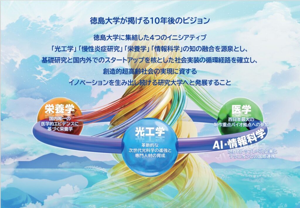本学は、4つのイニシアティブ(「光工学」「慢性炎症研究」「栄養学」「情報科学」)の研究力を結集し、世界が直面する超高齢社会の課題解決に挑戦していくことを10年後のビジョンとして掲げ、創造的超高齢社会(*)の実現に資するイノベーションを生み出し続ける研究大学へと発展してまいります。