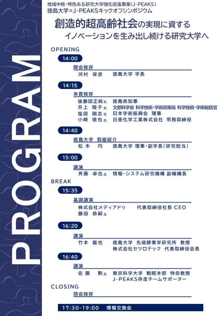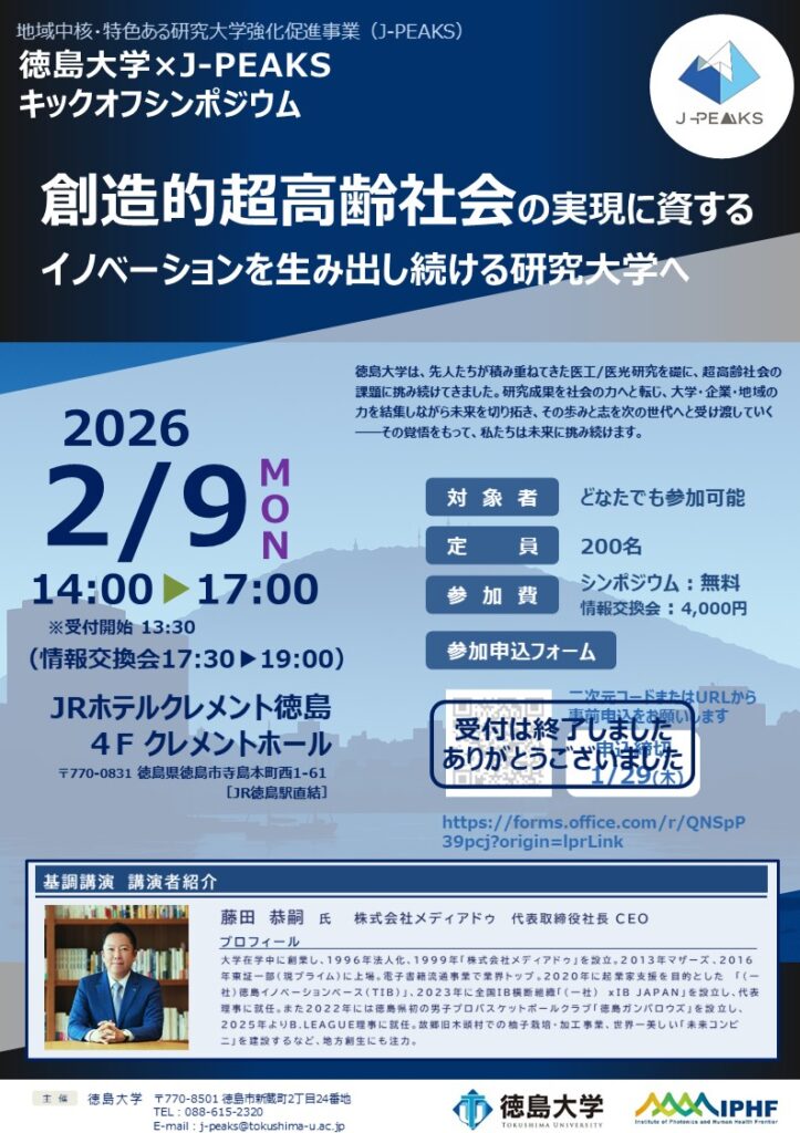 令和8年2月9日(月)に、「徳島大学×J-PEAKS キックオフシンポジウム」を開催します。